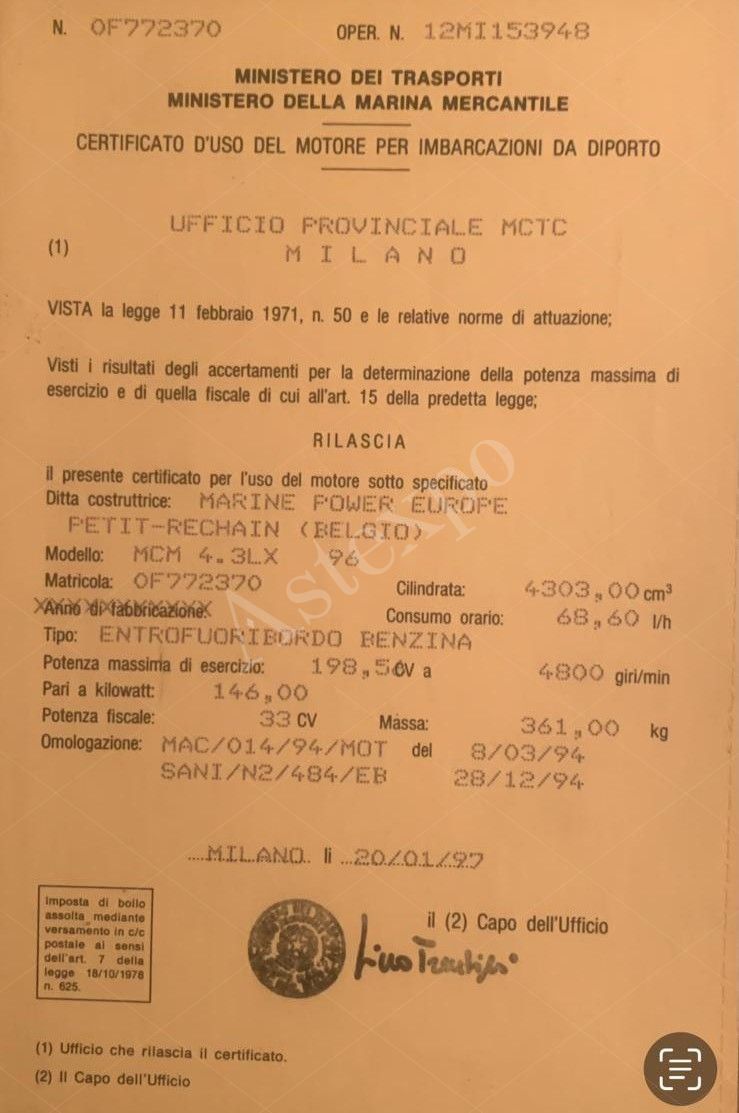 Motoscafo Rio 650 Open con motore EFB Mercruiser 4.3 LX del 1997. Solo acqua dolce. Verricello elettrico, dotazioni di bordo, ecoscandaglio Garmin. Disponibile per la visione a Sesto calende. Si precisa che: nel caso in cui non dovessero pervenire offerte, sarà possibile inviare formale manifestazione di interesse indicando il nuovo prezzo che si intenderà offrire per il bene. Tali richieste dovranno essere inviate al seguente indirizzo mail: aste@astexpo.it.